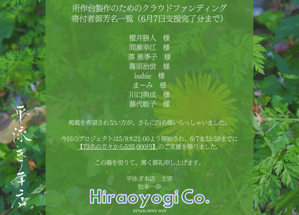 2024年5月野外劇 所作台製作のためのクラウドファンディング寄付者御芳名一覧(6月7日支援完了分まで。) 櫻井勝人 様 間瀬幸江 様 落 雅季子 様 篠原治世 様 isshie 様 まーみ 様 川口典成 様 藤代敏子 様 掲載を希望されない方が、さらに四名様いらっしゃいました。 今回のプロジェクトは5/9木21:00より開始され、6/7金23:59までに【73名の方々から535,000円】のご支援を賜りました。 この場を借りて、篤く御礼申し上げます。 平泳ぎ本店 主宰松本一歩 共有: X で共有 (新しいウィンドウで開きます) X Facebook で共有 (新しいウィンドウで開きます) Facebook いいね 読み込み中…